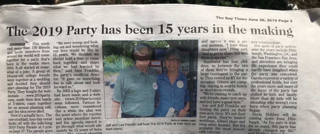 The 2019 Party was a friends and family reunion 15 years in the making. The party took place on June 26-30, 2019 on Kent Island, part of Maryland’s Eastern Shore. People came from across the country and as far away as Italy for days of fun, reunion and connections with friends new and old. It featured a parade, singalong, fireworks, variety show, treasure hunt, and more. Visit the party website for more.